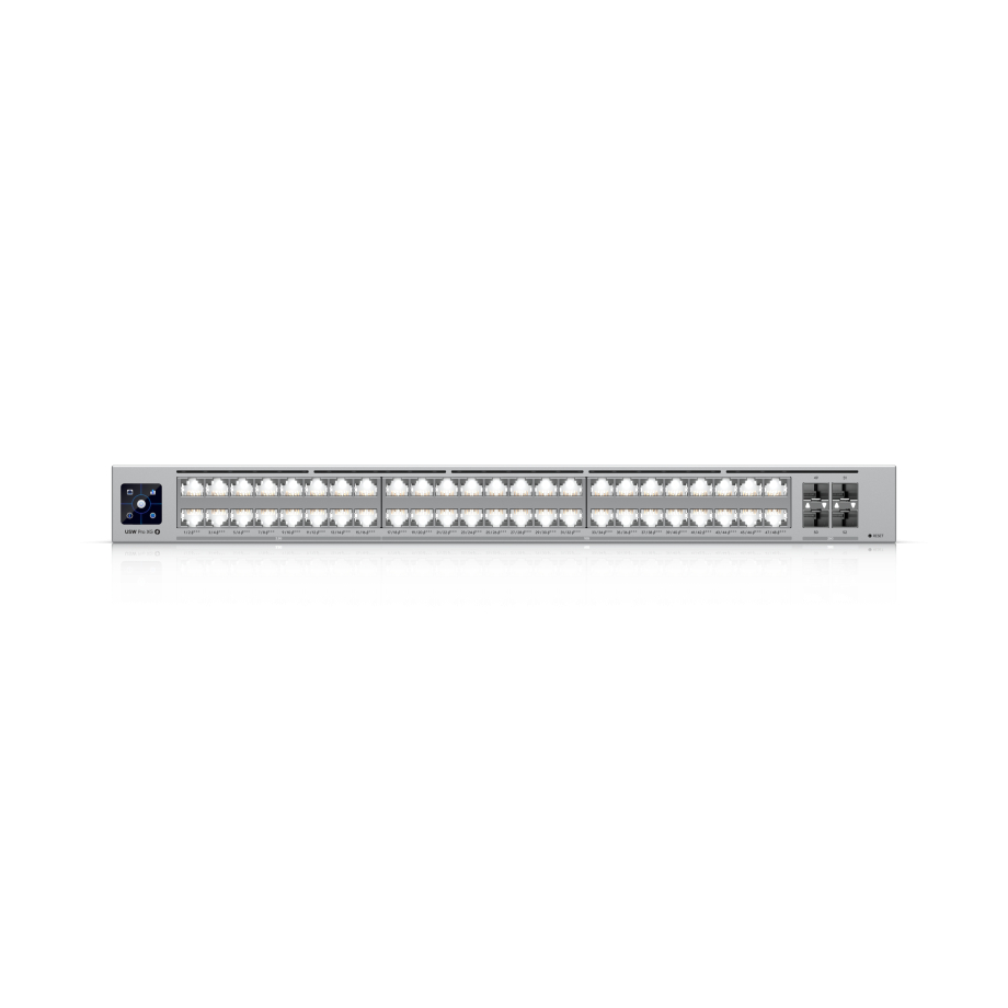 El Ubiquiti UniFi Switch Pro XG 48 PoE es un conmutador de capa 3 de nivel profesional diseñado para ofrecer conectividad de alto rendimiento y distribución de energía para las redes empresariales modernas. Con un total de 48 puertos Ethernet, incluidos 32 puertos compatibles con hasta 10 GbE y 16 puertos compatibles con hasta 2,5 GbE con capacidad PoE, proporciona una conectividad flexible para una amplia gama de dispositivos. Además, cuatro puertos SFP28 de 25 G permiten enlaces ascendentes de alta velocidad para la agregación o la integración en la red central. La función Etherlighting integrada mejora la usabilidad al proporcionar una identificación visual de los puertos, lo que simplifica la instalación y la resolución de problemas en implementaciones complejas. Esto facilita la gestión de un gran número de conexiones en centros de datos o entornos empresariales donde la claridad y la eficiencia son esenciales.